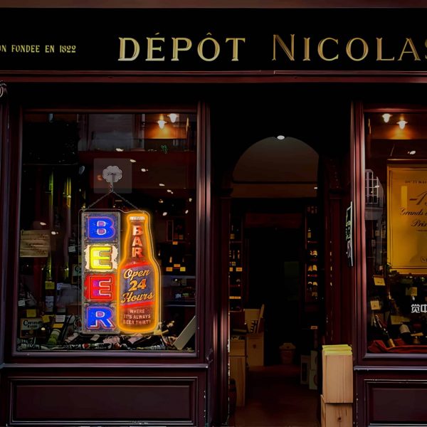 Transformez votre espace avec cette enseigne LED Beer Bar “Open 24 Hours” , au design fun et coloré ! Conçue pour décorer un coin bar, un salon, une cave ou une pièce de style man cave , cette lumière décorative apporte immédiatement une touche vintage et festive.