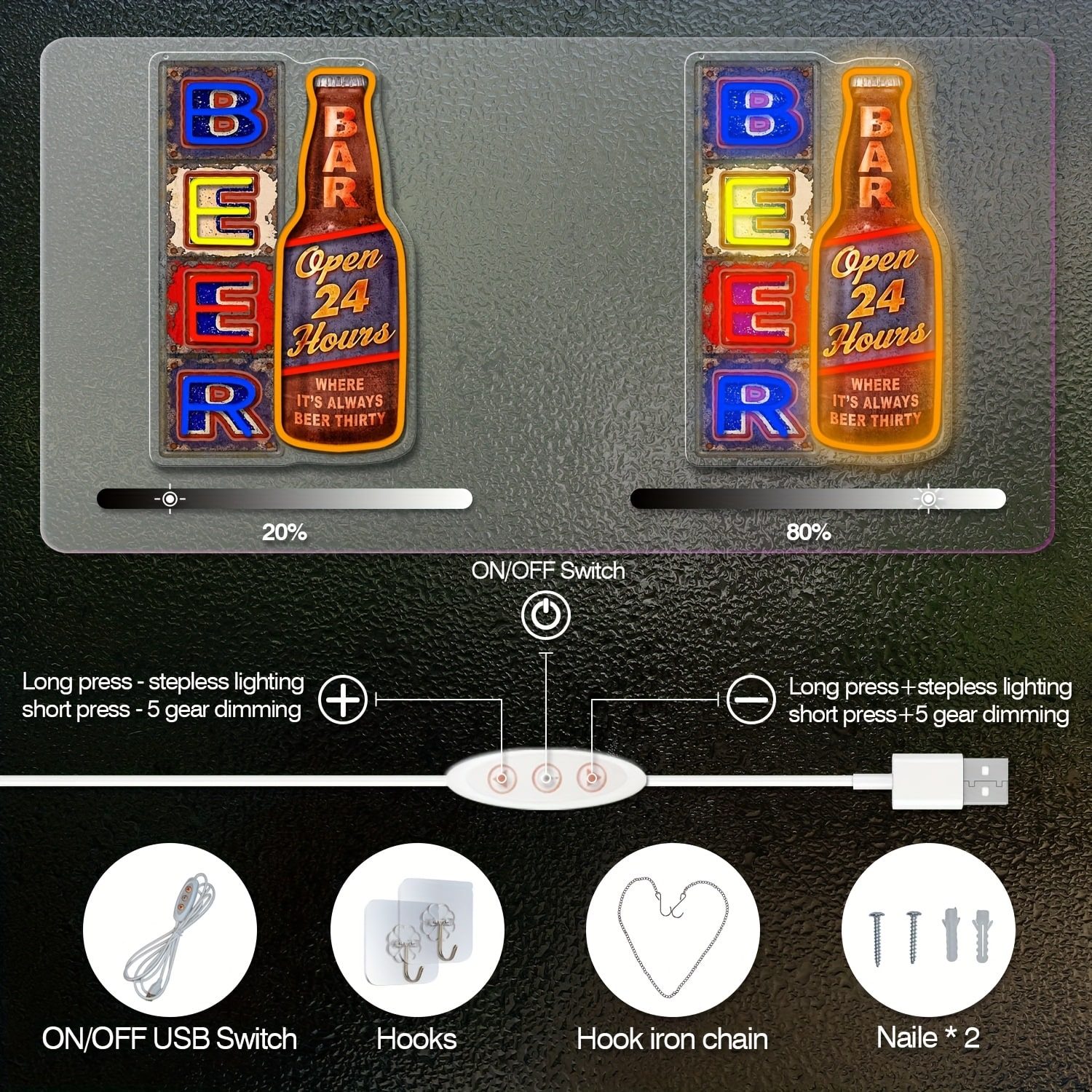 Ce panneau lumineux s’accroche simplement grâce à ses trous de fixation intégrés. Il s’alimente via un câble USB standard (inclus), sans piles ni branchements complexes. Une molette permet d’ajuster l’intensité de la lumière pour créer l’ambiance parfaite à tout moment.