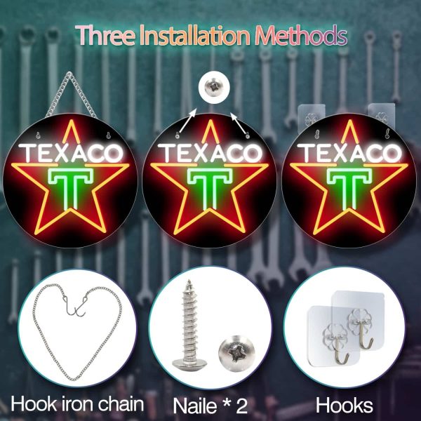 Cette enseigne LED TEXACO de 30 cm de diamètre est idéale pour recréer une ambiance rétro de station-service ou d’atelier mécanique. Avec son visuel emblématique en forme d’étoile verte et rouge, accompagné du logo TEXACO rétroéclairé, elle attire instantanément le regard et sublime vos murs.