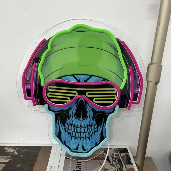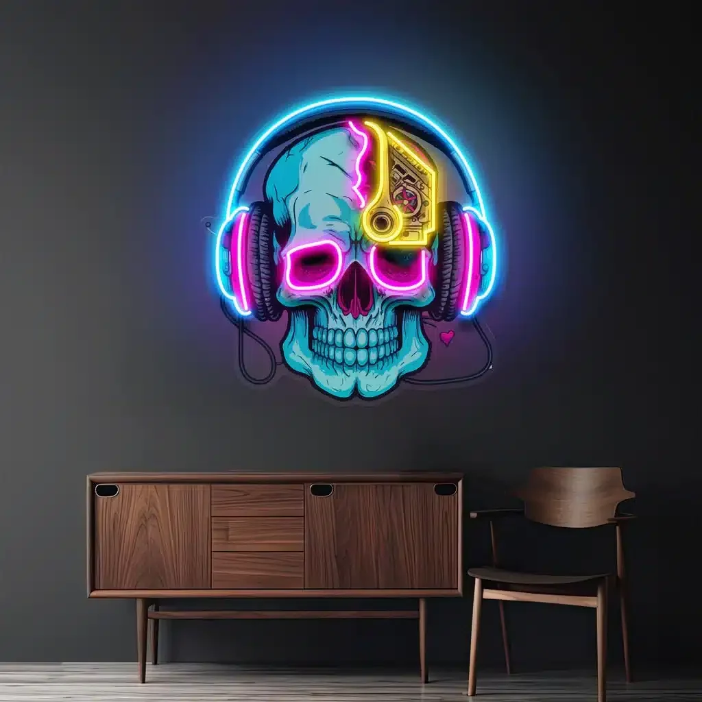 Envie de personnaliser votre mur avec une déco qui envoie du lourd ? Cette enseigne néon LED en forme de tête de mort avec casque audio est la pièce centrale parfaite pour une chambre gamer, un bar ou un coin chill à la maison. L’effet visuel est tout simplement hypnotique !