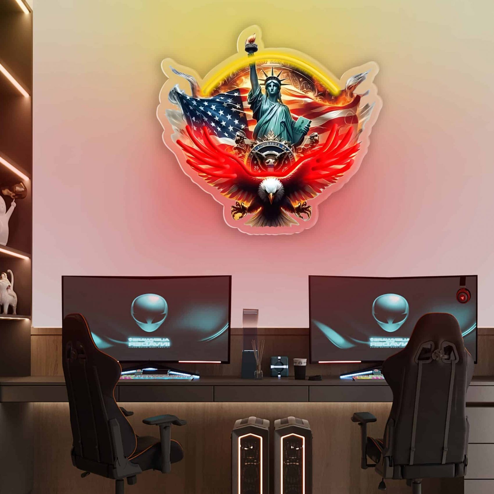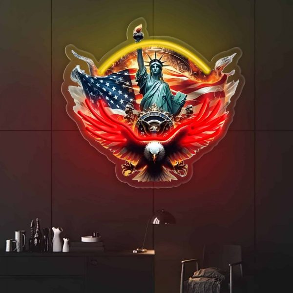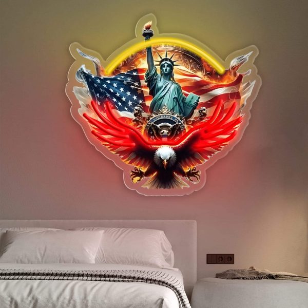 Offrez à vos murs une déco lumineuse audacieuse et pleine de caractère avec cette lampe LED murale “Statue de la Liberté & Aigle” . Pensée pour les amateurs de culture US et les fans de liberté, cette enseigne en plastique imprimé et découpé met en valeur les symboles iconiques de l’Amérique : l’aigle royal, le drapeau américain, et bien sûr la Statue de la Liberté.