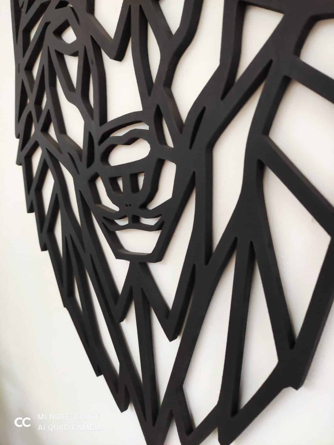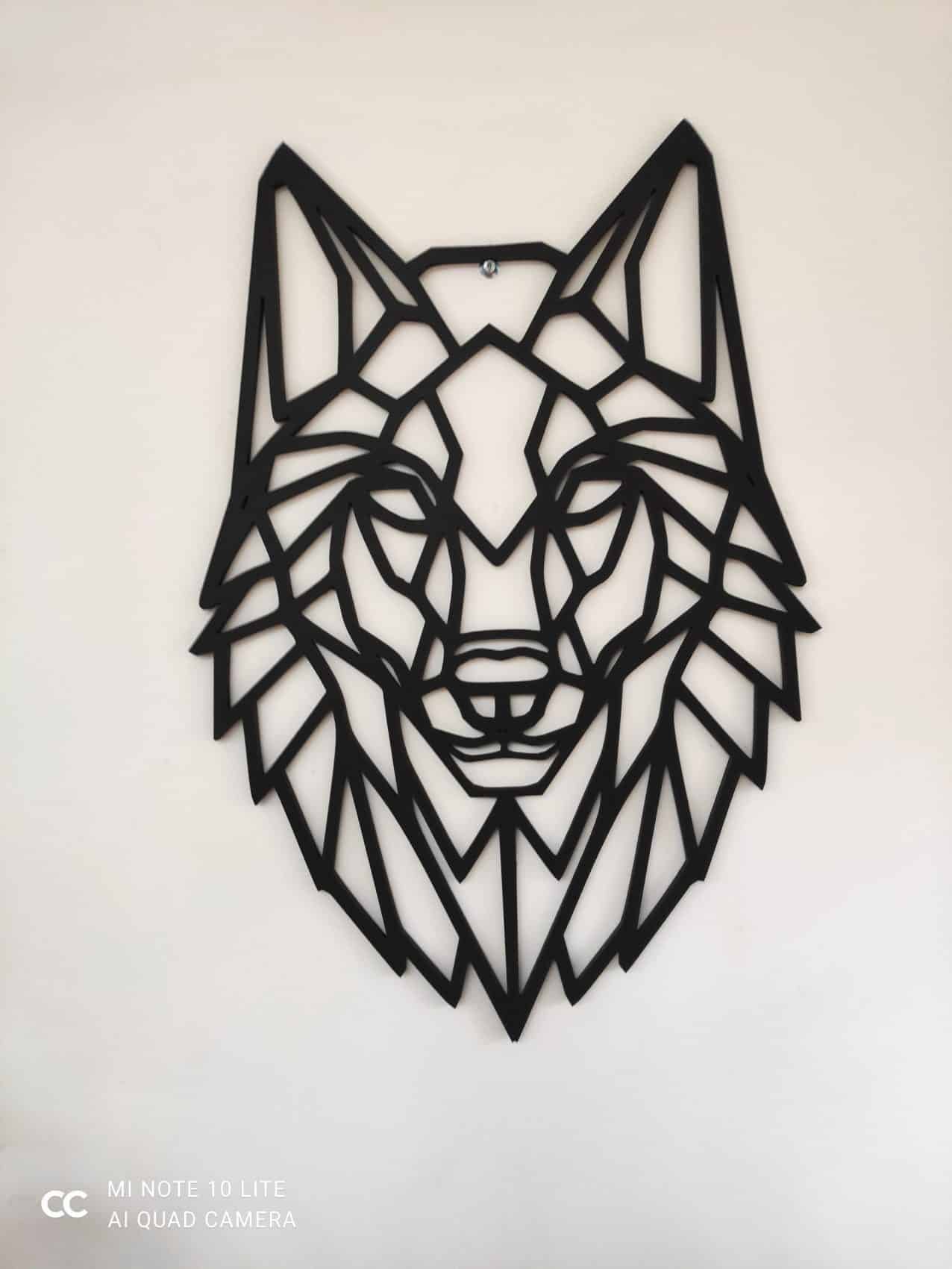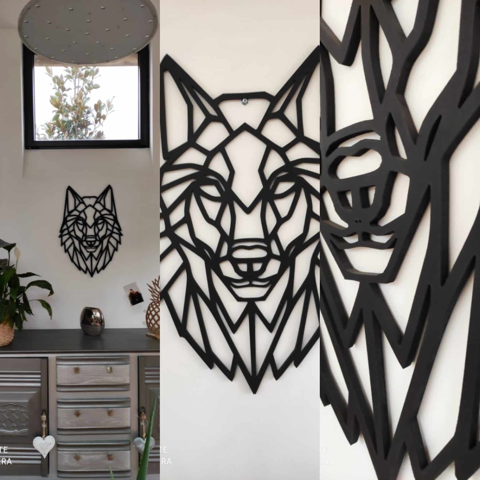Loup origami en MDF avec une face noire anthracite teintée dans la masse et une face peinte en noir brossé.